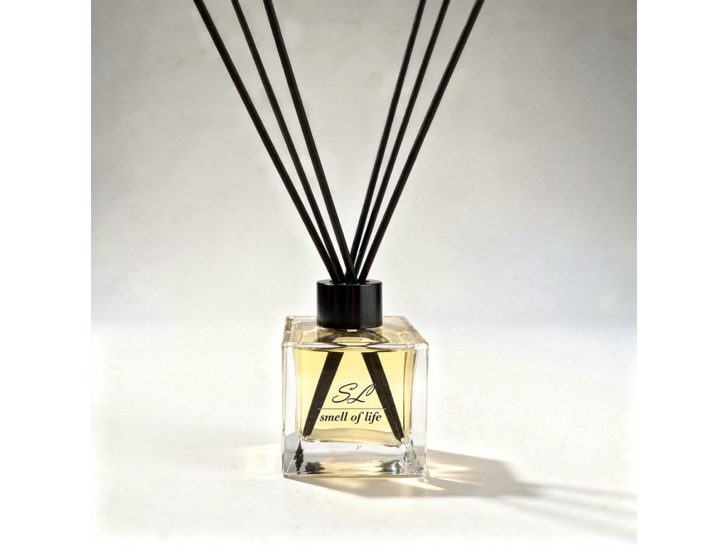 Součástí balení je skleněný aroma difuzér, 5 ks černých rákosových tyčinek k uvolnění vůně, černá krabička